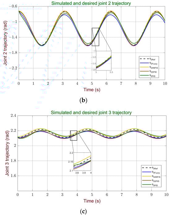 Joint trajectory performance comparison of the controllers: (a) performance comparison for joint 1; (b) performance comparison for joint 2; (c) performance comparison for joint 3.