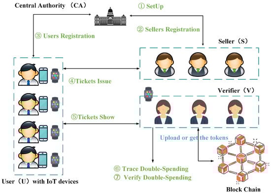Electronic ticketing systems involve five entities, as presented in Figure 1: the Central Authority (CA), Ticket Seller (S), User (U) with IoT device (such as smartphones), Blockchain (), and Ticket Verifier (V). This section describes each individual function in turn.