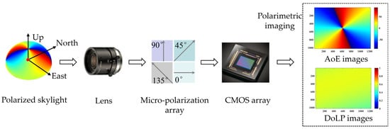 where the parameter is the total intensity of the skylight; the parameter describes the amount of linear horizontal or vertical polarization; the parameter is the amount of linear +45° or −45° polarization. The parameter is the amount of right or left circular polarization contained within the beam, and the content of this component in the skylight is extremely small [1], so it can be ignored in the skylight imaging. The parameter is the degree of polarization of skylight; represents the angle of polarization of skylight; is the ellipticity angle of skylight.