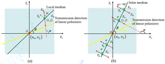 Projection of polarized light from the sky (in the local coordinate system) on the imaging plane; (a) the projection of any incident light beam; (b) the projection of the incident light beam on the solar meridian.