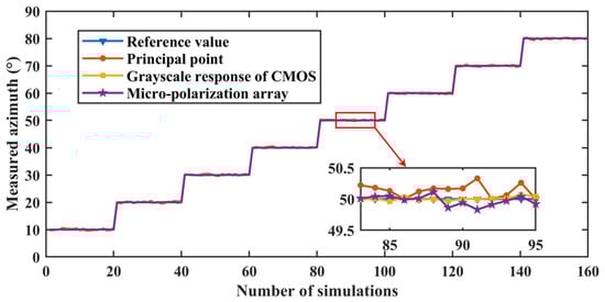 According to the error parameter setting in Table 1 and the measurement model of BPINS, 160 numerical simulation experiments were conducted randomly for each error source, and the solar azimuth angle was changed every 20 times. Eight sets of numerical simulation experiments were performed at a solar altitude angle of 5° and a solar azimuth angle between 10° and 80° to obtain the skylight polarization pattern. We started the first set of experiments setting the solar azimuth angle to 10° and conducted one set of experiments for every 10° increase. The set solar azimuth angle is reciprocal to the measured azimuth angle, which adds up to 90°. The reference value of the azimuth is 90° minus the set solar azimuth. The simulated skylight with a known polarization state is incident into the measurement model of BPINS, and the azimuth angle is extracted from the AoE image with the measurement error, and the measured azimuth is compared with the ideal azimuth. Figure 6 shows azimuth measurement results for the effect of a single factor. Figure 7 shows the azimuth measurement errors corresponding to a single factor.
