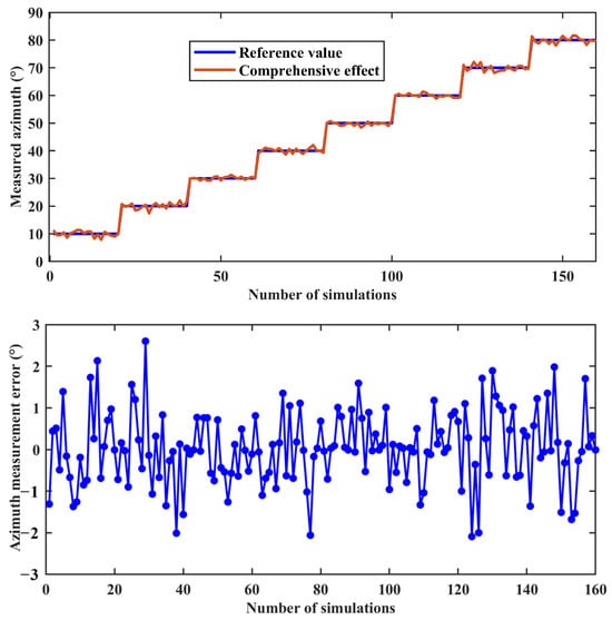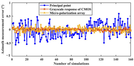 Combined simulation experiments were conducted with the same number of times as the single factors, also changing the solar azimuth every 20 times. Figure 11 shows an example of the imaging results from one of the comprehensive simulation experiments for a solar altitude angle of 5° and an azimuth angle of 20°. Figure 11a,b show the true AoE image and the true DoLP image, respectively, used to generate the Rayleigh scattered skylight incident into the uncalibrated BPINS. Figure 11c,d are the AoE image and DoLP image measured by the BPINS, and Figure 11e is the difference between the true AoE image and the measured AoE image. As can be seen from Figure 11c, the measured AoE image is not very smooth, especially at the edges, in the same way as the measured DoLP. Figure 12 shows the azimuth measurements affected by the combined effect of these four error sources. A total of 160 combined simulation experiments show that for uncalibrated BPINS, the combined effect of these error sources has a relatively large impact on the BPINS measurements. Under the combined influence of these error sources, the azimuth measurement accuracy of BPINS is 0.8839°.