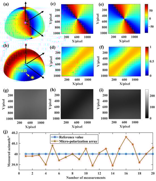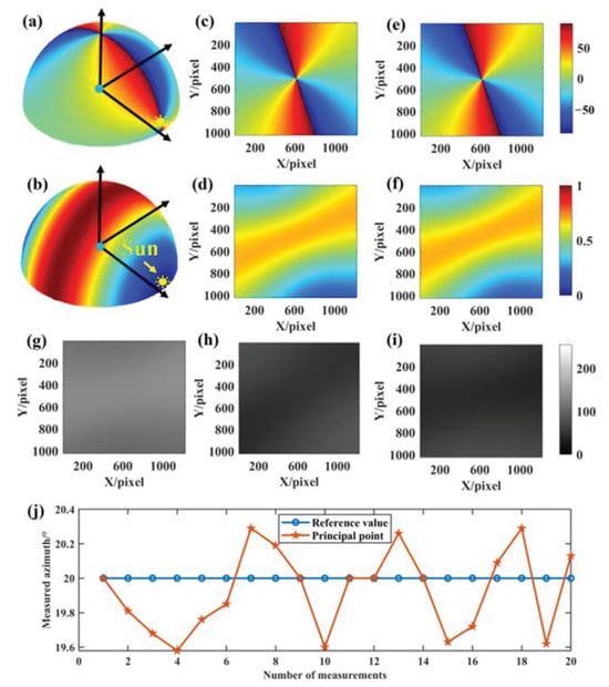 Imaging results of coordinate offset of a principal point. (a,b) are the three-dimensional skylight polarization pattern for a solar altitude angle of 5° and an azimuth angle of 70°; (c) the true AoE image; (d) the true DoLP image; (e) the measured AoE image; (f) the measured DoLP image; (g–i) are the 0°, 45°, and 90° directional intensity images, respectively; (j) is the result of azimuth extraction for 20 simulations with the solar azimuth set to 70°, where the reference value is 20° and the measured value is reciprocal to the set solar azimuth.