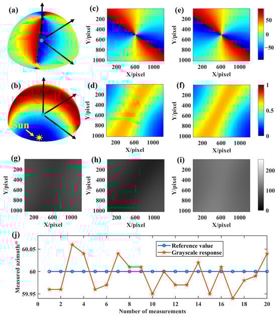 Imaging results of grayscale response inconsistent of CMOS. (a,b) show the three-dimensional skylight polarization patterns for a solar altitude angle of 5° and an azimuth angle of 30°; (c) the true AoE image; (d) the true DoLP image; (e) the measured AoE image; (f) the measured DoLP image; (g–i) are the 0°, 45°, and 90° directional intensity images, respectively; (j) is the result of azimuth extraction for 20 simulations with the solar azimuth set to 30°.