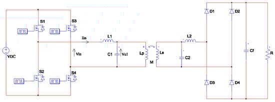 The equivalent circuit can be simplified as in [15,26], as shown in Figure 2. The inverter circuit can be reduced to a sinusoidal voltage source (1) and the rectifier circuit, in combination with the load, provides an equivalent load impedance (2). The voltage is then transmitted through the LC resonant circuit model, from the primary to the secondary, and eventually to the load.