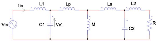 where ZL1, ZC1, ZLp, ZM, ZLs, ZL2 and ZC2 represent, respectively, the impedance at the resonant frequency of L1, C1, Lp, mutual inductance (M), Ls, L2 and C2. And, Iin, Ip, Is and I2 represent input current and current flowing through Lp, Ls and L2.