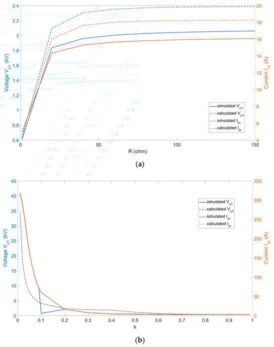 Comparison of measured and calculated values of Vc1 and Iin (a) Load (b) Coupling coefficient k.