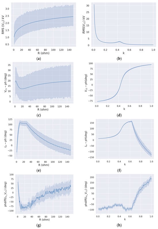 Figure 4 depicts the changes in various characteristics as load and coupling are adjusted. Figure 4a displays the graph of the RMS of VC1 versus the load. With increasing load values, the RMS of VC1 also increased. The graphs of the RMS of (Iin, amplitude of Iin and VC1), MAX of (Iin, VC1, amplitude of Iin, and VC1) versus load exhibited a similar shape to the graph in Figure 4a due to the proportional relationship between Iin and VC1, following Equations (9) and (10). Figure 4b shows the graph of RMS of VC1 versus coupling. As the value of k increased, the RMS of VC1 decreased. The presented graphs demonstrate the relationship of the RMS and MAX values of (Iin, amplitude of Iin, and VC1) versus the coupling factor, showing the same shape as the graph presented in Figure 4b. In Figure 4c, the graph displays the VC1 spectrum phase versus the load, which demonstrated a significant decrease, followed by a slight increase. Similarly, in Figure 4d, as the coupling factor increased, the phase angle also increased. As shown in Figure 4e, there was a slight increase and decrease in the phase of the input current as the load value increased. Figure 4f displays the VC1 spectrum phase changing significantly by coupling, resulting in increase and deceleration. Figure 4g,h display graphs that were unstable, which may suggest that the phase difference feature had the least impact on the prediction of load and coupling. After examining all the graphs, it is apparent that the phase parameter displayed varying shapes while the other parameters featured consistent or erratic graphs. Therefore, it is possible to anticipate that the phase parameter may play a major or minor role in determining the load and coupling factor.