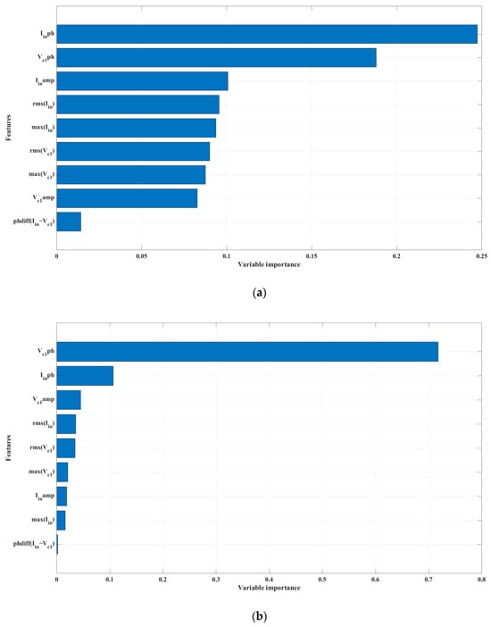 Based on Figure 5, the input current phase was essential for load estimation, whereas the voltage VC1 phase was vital for coupling prediction. Additionally, the other features, aside from the VC1 voltage phase, were insignificantly relevant for the prediction of the coupling factor, as illustrated in Figure 5b. The most significant feature for load prediction as depicted in Figure 5a, had a comparatively low value. However, the difference between this feature and the others was not substantial, which significantly demonstrated that most variables had a noteworthy impact. Comprehending the importance of variables enables the selection of suitable inputs that will promise the most precise predictions. Removing low-ranking features will reduce memory usage, computational costs, boost model accuracy, and prevent overfitting.