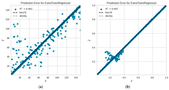 Table 3 presents the R2 and MAPE values for the five best-trained model algorithms. The extra trees regressor algorithm produced the lowest MAPE value for both predictions. The accuracy of the load prediction model was approximately 99.89%, and the coupling prediction’s accuracy was around 99.98%. Consistent with the findings in [15], the coupling prediction was more accurate than the load prediction. The observed discrepancy is illustrated in Figure 6, where the predicted value which was , was compared to the actual value . Specifically, in Figure 6b, which represents the coupling, the points cluster around the first bisector, while for the load in Figure 6a, some values deviated from the first bisector.
