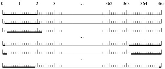 As an example, let us take the original YLCM data series with a registration (integration) interval of 3 h (M = 365 × 24/3 = 2920), which we transform into a time series with an integration interval of 2 days, obtaining an additional data array Ci(t = 2 days). Figure 1 shows an example of a scheme for such a transformation through a “moving average” with a shift of 3 h.