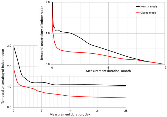 The data analysis in Figure 2 shows that the most significant reduction in temporal uncertainty is observed in the measurement duration interval up to two days. Then, in the interval from 2 to 7 days, the reduction is less sharp, and in the measurement duration interval of more than 14 days, the rate of reduction of temporal uncertainty becomes very small. This important experimental observation explains the appropriateness of conducting short-term measurements in the interval from 2 (or better from 4) to 7 days. Measurements over several minutes or hours (so called “spot” measurements), which, in Figure 2, correspond to t = 0, are characterized by too-high (more than 200%) and uncontrollable temporal uncertainty, so they cannot be used, in principle, for conformity assessment, according to the world practice of indoor radon testing.