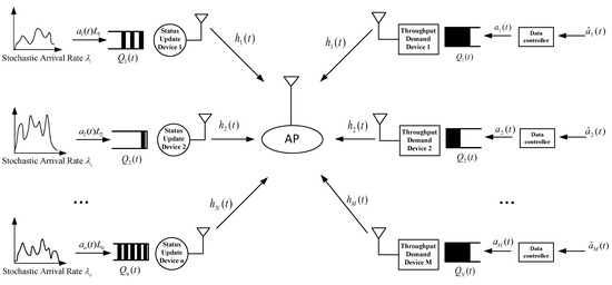 As shown in Figure 1, let us consider an uplink multiple-access system with M throughput-demand devices and N status-update devices. Devices for both types of services transmit their data from upper-layer applications to the access point (AP) in a time-division multiple-access (TDMA) manner. All services are equipped with a data buffer to temporarily store data from either the installed sensors or upper-layer applications. Let and denote the data buffer states in time slot t for throughput-demand device m and status-update device n, respectively, both of which assume the first-come, first-served (FCFS) queuing policy. In addition, we assume that there is a data controller for each throughput-demand device to control its traffic arrival. We assume that the system can acquire perfect channel state information (CSI) for all devices to the AP and that all channels are block fading. Let and denote the channel coefficients from the throughput-demand service device m and the status-update service device n to the AP in time slot t, respectively. We use the binary variable to indicate whether device k is scheduled to transmit data at time slot t. More specifically, represents the throughput-demand device, and represents the throughput-demand device status-update device at time slot t. Due to the use of TDMA transmission mechanism, . The signal received by the AP from device k can be expressed as: