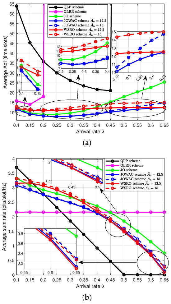 Average AoI and average sum-rate performance with different status-update arrival rates , , . (a) Average AoI performance with different status-update arrival rates; (b) Average sum-rate performance with different status-update arrival rates.