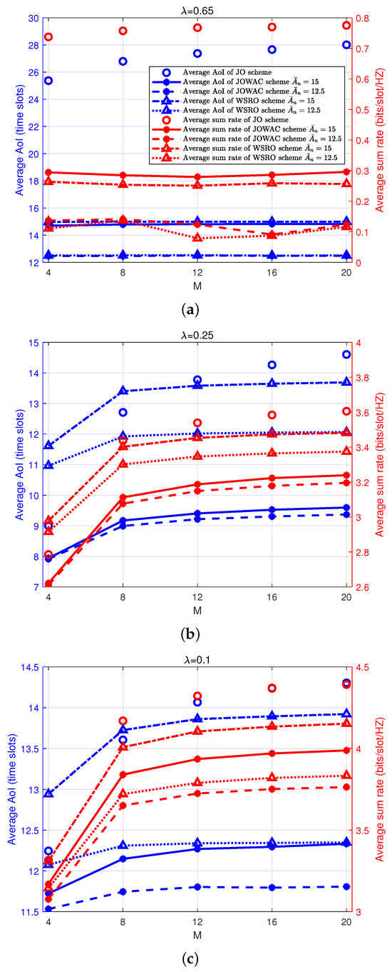 In Figure 3, we show the realized-average AoI and average sum-rate performance with a different number of throughput-demand devices M and different status-update arrival rate using JOWAC, WSRO, and JO schemes. As shown in Figure 3a, with a high arrival rate (), the average sum-rate performance and the average AoI performance of the remaining schemes, except for the JO scheme, remain almost unchanged as M increases. This is because the JO scheme does not consider the average AoI constraint, and the total number of transmission slots obtained by the throughput-demand devices increases as M increases. Hence, in this case, the average AoI will degrade, and the average sum rate will also increase slightly as M increases. On the other hand, both the JOWAC scheme and the WSRO scheme consider the average AoI constraint . One can observe from Figure 3a that the realized-average AoI performance of both JOWAC and JO schemes stays below and remains unchanged as M increases. The realized-average sum-rate performance is almost unchanged as well, which can be explicated by the fact that even though M increases, to make sure that the average AoI constraints can be satisfied, the system must allocate (reserve) enough transmission opportunities for status-update devices. As a result, the average sum-rate performance will remain unchanged because the throughput-demand devices cannot have more transmission opportunities with the increase of M. However, the increase of M will decrease the average rate allocated to every single throughput-demand device. Within a low to moderate arrival-rate region (), as shown in Figure 3b,c, the average AoI degrades, and the average sum rate improves with the increase in M. This is because, within a low to moderate arrival-rate region, the backlog of the data queue of the status-update devices is not severe, and the average AoI can be ensured to be below . Therefore, the system will try to allocate more transmission resources to throughput-demand devices. Basically, due to the increase in M, the transmission opportunity obtained by every single throughput-demand device decreases, and the backlog size increases, which leads to a decrease in the amount of extra data put into by the upper-layer application. In fact, the amount of backlog size will gradually approach the stabilization value when M is large enough. Compared with the JOWAC scheme, because there is no average AoI constraint in the JO scheme, its realized-average AoI and average sum-rate performance will exhibit a more noticeable increase.