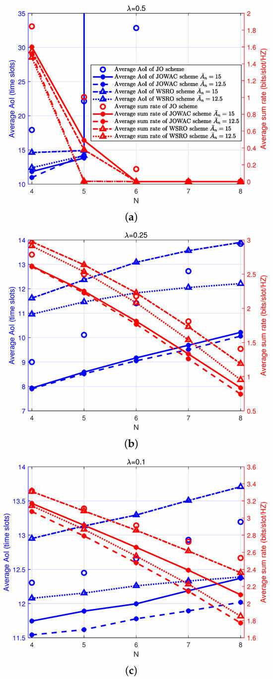 Similarly, we illustrate the realized-average AoI and average sum-rate performance with different numbers of status-update devices N and different status-update arrival rates in Figure 4. As shown in Figure 4a, within high arrival rates (), a slight increase in N makes the average AoI tend to infinity and the average sum rate drop to almost zero. This happens when the system has already consumed almost all available resources to support the critical transmission requirements by the existing status-update devices. In extreme cases, the system cannot afford one more status-update device with a strict average AoI requirement, which leads to scheduling failure. Basically, the JO scheme can support more status-update devices, but it does not ensure the average AoI requirement for every status-update device. As shown in Figure 4b,c, within low to moderate arrival-rate region (), both the average AoI and the average sum-rate performance degrades as N increases. The WSRO scheme can satisfy the average AoI constraint , even if it does not consider the average AoI in the optimization metric. This is because the JO scheme does not consider the AoI constraint. It tends to allocate more transmission opportunities for the throughput-demand device, which makes it capable of realizing reasonable average sum-rate performance. This phenomenon will become more obvious at low arrival rates (). The JOWAC scheme considers both the average AoI constraint and the AoI optimization objective. As expected, it can always realize the optimal average AoI performance in all cases. As N increases, the realized AoI performance degrades as well, since now more update status devices need to share the transmission opportunities to fulfill their critical freshness requirements. As a result, there will be a worse average sum-rate performance for the throughput-demand devices. Finally, we can conclude from Figure 3 and Figure 4 that the JOWAC can always realize the best average AoI performance, regardless of the choice of M and N in all status-update arrival-rate regions, which confirms that the introduction of average AoI optimization metric and considering the average AoI constraint are necessary when there are critical AoI performance requirements. Because strict resource demands are required to ensure AoI performance, there will be some loss in the average sum-rate performance for the throughput-demand devices, just as we can expect for a heterogeneous access network.