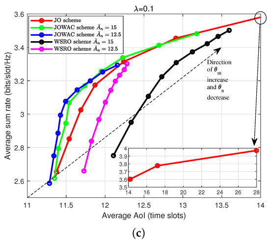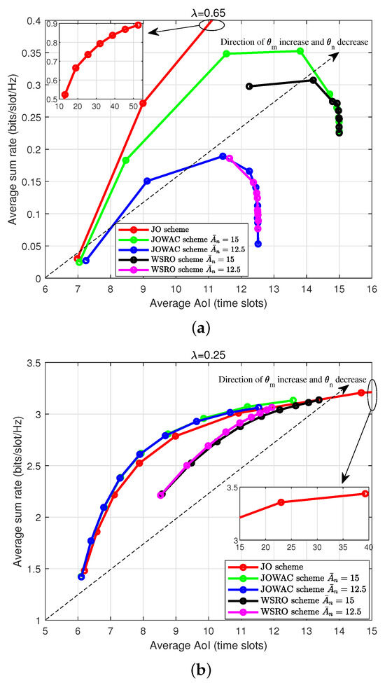 To clearly highlight the tradeoff between the average AoI performance of the status-update devices and the average sum-rate performance of the throughput-demand devices, we illustrate the AoI-sum-rate tradeoff of the JOWAC scheme, the WSRO scheme, and the JO scheme in Figure 5. For the JOWAC scheme and the JO scheme, and vary in the opposite direction, namely the direction of increase along the x-axis and y-axis is the direction in which increases and decreases, respectively, i.e., the leftmost corresponds to , while the rightmost is . For the WSRO scheme, there is only one weighting coefficient of , the leftmost is , while the rightmost is . In heterogeneous status-update and throughput-demand services access networks, we always expect to realize as small as possible AoI and as much as possible sum rate. The leftmost and steepest tradeoff curve is desired. One may readily observe that, except for the large status-update rate case (i.e., ), the proposed JOWAC scheme can achieve the best tradeoff. Since the WSRO scheme does not consider the AoI optimization metric, its tradeoff is noticeably inferior to the JOWAC scheme. Compared to the JO scheme, since both the JOWAC scheme and the WSRO scheme consider the AoI constraint, they will try their best to ensure the realized AoI is below the AoI constraint limit at the cost of the reduction in the realized sum-rate performance, as illustrated in Figure 5a. Although the JO scheme seems to be able to realize reasonable tradeoffs in large status-update arrival rate (i.e., ), it cannot guarantee the realized AoI performance.
