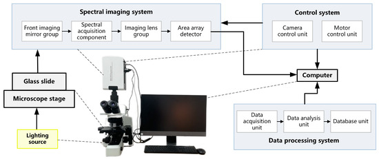 The data used in this study were all acquired by the micro-hyperspectral imaging system, MICROspecim. MICROspecim consists of a spectral imaging system, control system, and data processing system, as shown in Figure 1. The spectral imaging system includes a front imaging mirror group, spectral acquisition component, imaging lens group, and area array detector. The control system includes a camera control unit and a motor control unit. The data processing system includes a data acquisition unit, a data analysis unit, and a database unit. A halogen lamp (400–2500 nm, 50 W) provides an active lighting source. The glass slide samples on the microscope stage are imaged on the area array detector through the spectral imaging system to complete two-dimensional information acquisition. Simultaneously, the control system operates the motor to complete another one-dimensional spatial information scanning. The control system and data processing system are uniformly integrated into computer software, responsible for datacube acquisition and post-processing. As a result, the hyperspectral data of directly smeared bacterial sample is obtained with a dimension of 226 (λ) × 800 (x) × 800 (y), where 800 × 800, which represents the image size (physical area size of 0.12 mm × 0.12 mm), and 226 is the number of spectral channels from 400 nm to 1000 nm. At present, MICROspecim has been applied in clinical pathology-assisted diagnosis and rapid bacterial analysis research.