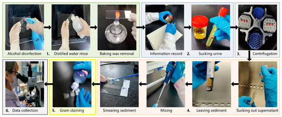 In this study, urine-smeared slides were used as experimental samples. After obtaining patients’ urine samples, a portion was taken as the experimental group for directly smeared urine sample preparation. Another portion served as the control group, and the urine sample was determined and labeled as either a positive or negative bacterial infection sample using the traditional culture test process. Moreover, the positive samples also needed to be labeled with information about the bacterial species they contained. This information served as the ground truth for training samples. The preparation process of directly smeared urine samples in the experimental group is shown in Figure 2: