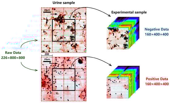 Extraction process of experimental sample from a raw urine sample. Each small red dashed box represents a spatial stride of 200 × 200, and each displacement can obtain an experimental sample. The black boxes represent the spatial size (400 × 400) of the experimental sample.