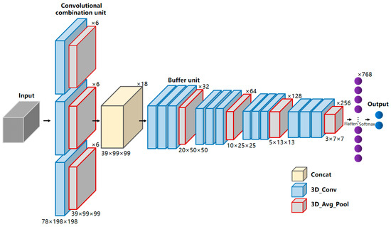 Model architecture of MBNet. MBNet mainly includes a convolutional combination unit, a feature concatenation layer, and four buffer units. The convolutional combination unit consists of three convolutional kernels with different dimensions, and each buffer unit consists of three convolutional layers and one downsampling layer. Among them, the yellow square represents the concatenation layer, the blue squares represent the 3D convolutional layers, and the gray squares represent the 3D average pooling layers.
