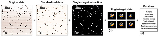 Database standardization process for directly smeared hyperspectral data. (a) Original data of a directly smeared bacterial sample. (b) Standardized data after standardized correction. (c) Binary image of target and background. (d) Single-target datacubes after single-target extraction. (e) The data content contained in the database.