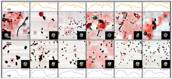Figure 7 shows the pseudo-color images and typical spectral curves of common targets in the directly smeared sample database, including several typical bacterial data and several representative impurity data. The impurities in Figure 7 contain flaky calcium phosphate crystal (CaP-Crys for short), magnesium ammonium phosphate crystal (MAPhos-Crys), ammonium urate crystal (AUr-Crys), calcium oxalate crystal (CaOx-Crys), Cast, and leucine crystal (Leu-Crys). The bacteria in Figure 7 contain C. tropicalis, S. aureus, K. pneumoniae, S. epidermidis, E. coli, and P. aeruginosa. Among them, the large images in Figure 7b,c are pseudo-color images containing the targets. The red boxes represent the locations of the targets, and the small images in the lower right or left corners are the datacubes extracted from the corresponding targets. It can be seen that positive samples with higher bacterial content usually have relatively fewer impurities, while negative samples tend to have a higher impurity content.