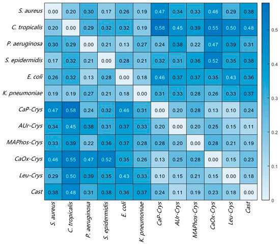 The images in Figure 7a,d represent the typical spectral curves of the corresponding target, with the horizontal axis representing the wavelength. Overall, there are significant differences in the spectral curve features between bacteria and impurities. However, there are some similar spectral features between several bacteria or impurities. For example, S. aureus and S. epidermidis both have a clear feature valley at the 60 spectral band (590 nm), which may be related to the fact that they both belong to the Staphylococcus genus [27]. E. coli and P. aeruginosa show similar trends in their spectral curves. AUr-Crys and Cast also share a continuous feature peak and valley between 90 and 110 spectral bands (660–705 nm). In order to have a clearer understanding of the spectral feature similarities between several common bacteria and impurities in Figure 7, SAM analysis was conducted for the above targets. The spectral curve of a specific bacterium or impurity was used as the reference spectrum, and the spectral curves of the other bacteria and impurities were treated as the test spectra. The typical spectral curve is derived by averaging the spectral curves of various bacteria in the database. The spectral angles between these spectra were calculated, and the results are shown in Figure 8. The closer the spectral angle is to 0, the more similar the spectral features are. The diagonal has values of 0 because the reference spectrum and the test spectrum are the same spectral curve.