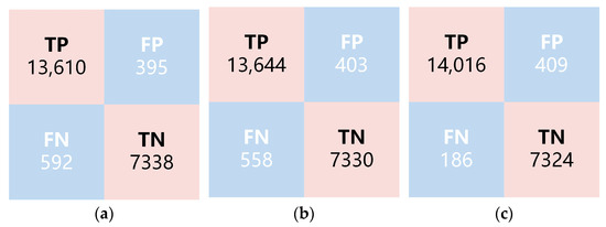 To test the impact of short-term cultivation on the positive–negative determination and further validate the model performance, the 0 h samples used in the above experiments were replaced with 3 h samples for model training and validation. The 3 h and 0 h samples remained consistent in terms of data collection, preprocessing, model architecture, and training mode. The difference is that the 3 h samples were prepared from the original samples after a 3 h short-term culture, rather than being directly smeared. The results of MBNet-3 h are shown in Figure 9b and Table 2. Compared with the results of MBNet-0 h, MBNet-3 h showed a slight improvement in both ACC and NPV, while PPV decreased slightly. This may be related to the increase in bacterial counts after short-term cultivation, which corrected some of the previously misclassified positive samples. However, overall, the improvement in each metric was not significant. Considering the time and labor costs associated with the 3 h cultivation, the feasibility of selecting 0 h samples is higher in practical applications. On the other hand, whether 0 h or 3 h samples are used, their NPV values are relatively low. NPV provides the probability of correctly identifying true negatives under negative results and is a metric for evaluating diagnostic or testing accuracy. A higher negative coincidence rate means that there is a higher level of confidence in correctly identifying true negatives under a negative diagnosis, which is relatively more important in clinical practice.