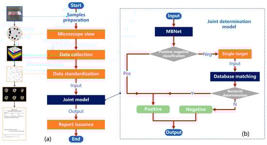 The determination solution of the whole process for positive–negative bacterial infection. (a) The flow chart of determination solution. (b) The flow chart of the joint determination model.