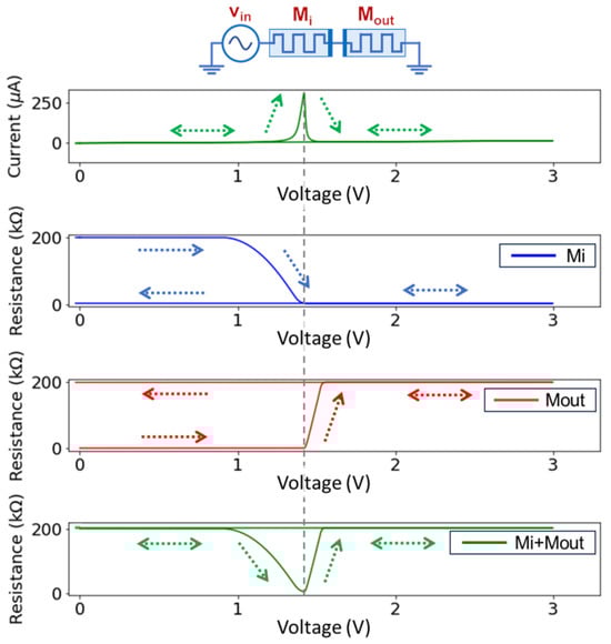 Figure 2. Simulation results for the performance of two anti-series memristive devices. The inset shows a schematic of the simulated circuit. The plots show the current through the two devices, the resistance of each one, and the sum of the two resistances, with respect to the applied voltage (Vin). The arrows are a guide to the eye for the evolution of every measured parameter. The vertical dashed line indicates the moment when the completion of the SET of Mi triggers the RESET of Mout.