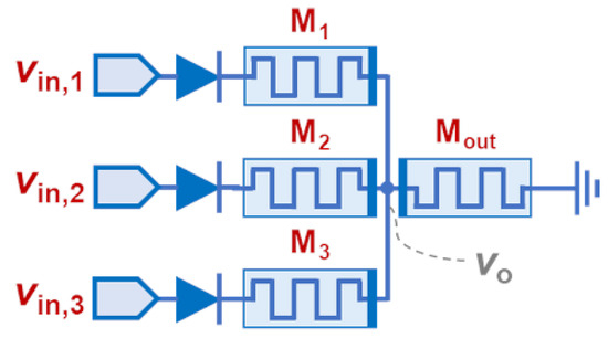 Next, we focus on the performance of a memrsitive star network with three input channels. The simulated circuit is shown in Figure 3. In every input branch, in series with the input memristive device (Mi), we used a diode to prevent the current flow towards the input terminals when the input voltage was at 0 V. The values of the memristive model parameters were kept as mentioned previously, except for the β parameters. Here, we used βSET = 4∙1010 Ω/(V∙s) and βRESET = 4∙1012 Ω/(V∙s), with a higher β for the RESET to comply with the memristive “fuse” concept, which requires the RESET to be as fast as possible. At the input terminals, we applied voltage pulses, which were 10-μs wide and had 2.2 V amplitude. Given a 0.7 V diode threshold, the effective voltage applied to the input channels was Vin = 1.5 V. Note that the VSET = 0.9 V is higher than the effective Vin/2, as required, whereas the value of VRESET = −0.3 V guarantees that the RESET of Mout will not be triggered unless a complete SET process has first occurred in any input device. Note that such values of the model parameters reflect the performance features expected for any memristive device suitable to be used in such applications.