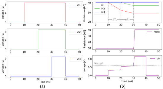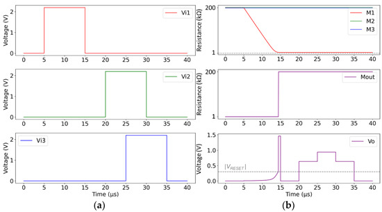 Figure 4. (a) Plot of the input voltage signals, applied to the three input channels of the star network. (b) Simulation results showing the time-evolution of the resistance of the input memristive devices (M1–M3), the output memristive device (Mout), and of the voltage at node Vo. The horizontal dashed line highlights the |VRESET| value.