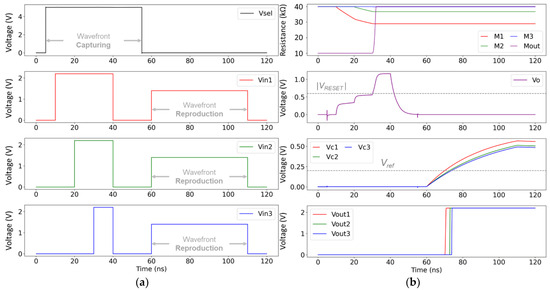 When Vsel is ‘1’, the MUXes allow the memristive star network to be formed, so the arrival of wavefronts can be stored in the memristive devices. Unlike in Figure 5b, we note that the parasitic capacitance of the transistors, implementing the MUXes, produces a different shape in the response at node Vo. However, the switching performance of the memristive devices is very similar to what was observed and discussed in previous simulations, so the information of the arriving wavefronts is correctly stored. Next, when Vsel is ‘0’, the input channels are connected to the network of comparators at the output stage. This circuit is based on a previous proposal in [14]. When the same voltage pulse is applied to all the input channels, the capacitors of the output lines are charged via the memristive devices. Different resistance values in the memristive devices generate different RC time constants, so the moment the comparison threshold Vref is reached is different in every comparator and depends on the previously captured timing characteristics of the incoming wavefronts. The latter produces a varied response at the output nodes Vout1 through Vout3 that allows for reproducing the order of the previously received wavefronts, as we can observe in Figure 7b. Note that the order of arrival is the only information that can be encoded in the state of the input memristive devices. The only way to achieve matching of the capturing and the reproduction time scales is by using variable capacitor values at the output lines. This, however, is not further explored in this work.