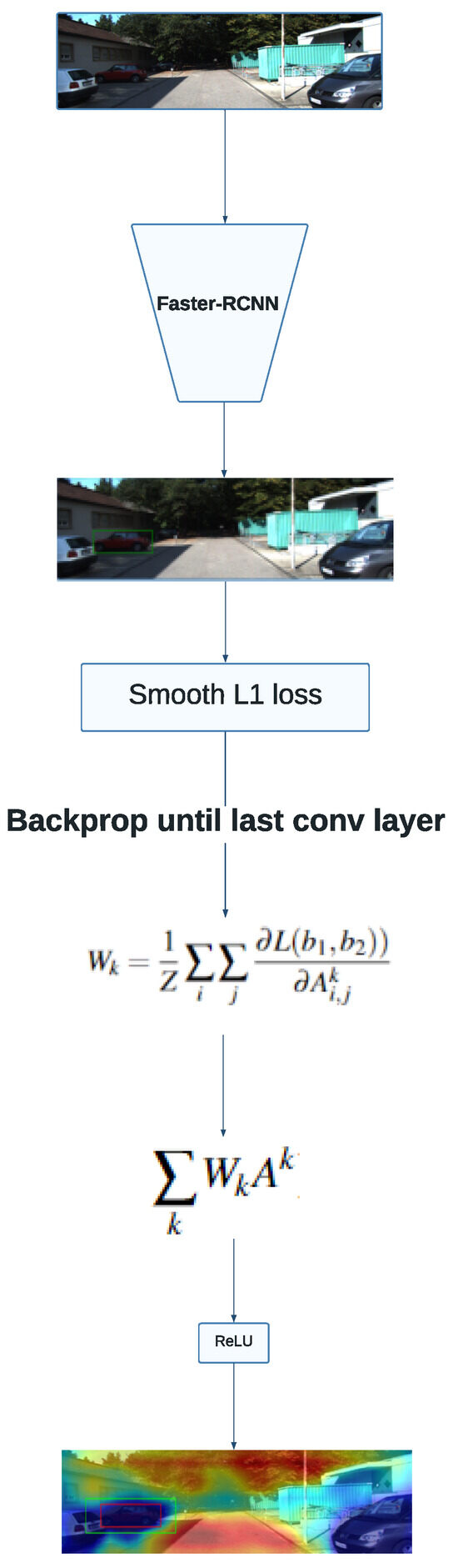 The overview of the experimental setup described is shown in Figure 1. The image flows in an unidirectional way since it is picked from the validation set, passing through an inference achieved by the detector, and finally, using the resulting feature maps to compute the final heatmap.