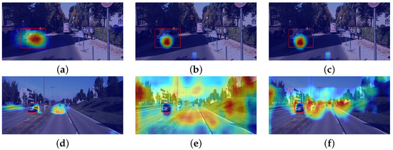 Figure 4 shows an overview of the results obtained using the Grad-CAM setup on the autonomous driving dataset. Overall, Grad-CAM is known for its noise vulnerability and spacial sensitivity. Moreover, increasing the number of convolutional layers enhances noise propagation throughout the network. The high number of calculations during forward propagation makes it hard to project the features back into the original input dimension. These limitations of Grad-CAM and gradient-based methods generally cause some explanations to have characteristics similar to those observed in Figure 4d–f.