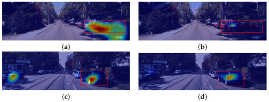 Figure 7 outlines the empirical results obtained with the contrastive grad-CAM technique for both datasets, using different backbone architectures. The regions highlighted in red represent features positively related to the increase of the relative loss between both detections (i.e., areas that help the model decide for the predicted bounding box instead of the contrastive example). On the other hand, blue zones represent a negative (or null) correlation between the corresponding features and the relative loss. In addition, in the autonomous driving context (Figure 7c,d), the noise level interfering with the saliency map production is seemingly superior. However, even in the latter case, which is naturally more demanding to explain, the method identifies regions within the predicted bounding box as not positively correlated to the loss increase. On the other hand, the activations are gradually increasing in the outer areas of the objects explained.