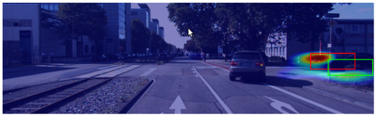 Figure 9. Contrastive explanation using the D-RISE method. The red bounding box represents the predicted bounding box, and the green box shows the contrastive example. The heatmap highlights the regions with higher activations in red.