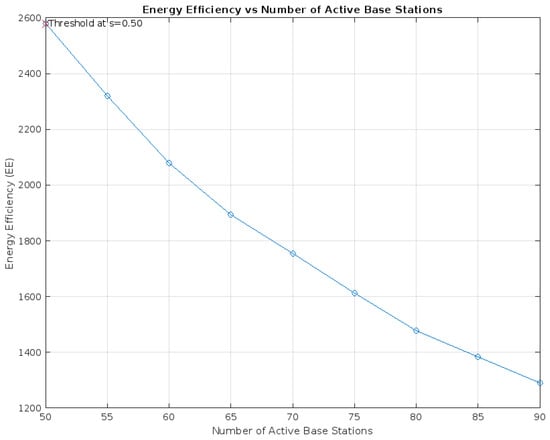 In this study, we evaluated the energy efficiency (EE) of a massive MIMO network using the simulation approach. Our focus was on understanding how the proportion of active base stations (s) and the load factor (ρ) affect the network’s EE. The experimental setup and simulation methodology used to validate the proposed optimization framework in your study involve a MATLAB simulation environment. The key parameters include 100 base stations and 1000 users. The simulation varies the proportion of active base stations (ranging from 50% to 90%) and employs fixed load factor and power consumption values for active and switched-off small base stations. The simulation randomly generates user capacities from both macro and small base stations and calculates EE for each scenario. The performance metrics used are EE and the number of active small base stations, plotted to visualize the relationship between base station activity and energy efficiency. The simulation parameters were carefully chosen to reflect realistic operating conditions for a massive MIMO network, as outlined in Table 2.