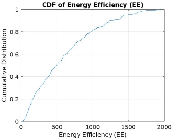 Figure 4 shows the cumulative distribution function (CDF) of Energy Efficiency (EE) values exhibits a steady ascent, reflecting a uniform spread across the observed range without abrupt fluctuations or outliers. The CDF of Energy Efficiency (EE) in a massive MIMO network reveals crucial insights into the distribution and variability of EE values. The CDF plot helps identify where the majority of EE values are concentrated; a steeper curve suggests most configurations cluster around lower EE values. The curve’s shape also indicates the degree of variability in EE across configurations, with a steeper initial slope pointing to less variability. Understanding these patterns is essential for gauging common EE levels and the likelihood of achieving various efficiency outcomes in network configurations.