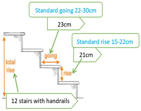 In daily life situations, people encounter a wide range of staircases with various dimensions, and all have a different influence on the risk of falling [,,,]. Staircase dimensions are essential to avoid stair falls, and irregular or challenging step dimensions in stairs can amplify the risk of falling [,]. The tread of the step (going) on the stair is vital in determining the percentage of foot length placed on a stair tread. Refs. [,] have shown that the gait of stair users depends on the size of the going such that if the going is large enough, users can place their whole foot onto the flat part of the tread. As the going decreases, the user allows their toes to hang over the edge of the tread or significantly turns their feet to continue their descent, which may increase the likelihood of a stairway fall. The authors of [] have shown that people manage to put a significantly greater part of their foot on a tread for goings of 300 mm and above compared to goings of 275 mm or less. This suggests that the tread of the steps (going) on the stair is vital in determining the percentage of foot length placed on the step. The staircase risers are also very important for avoiding trips. If the risers are high, older people may become fatigued quickly and become vulnerable to trips []. Staircases with a large step risers create additional demands for joint moment generation during stair ascent [] and control of the CoM during descent []. When risers are very short or shallow, older adults may be tempted to take more than one step at a time, which leads to more chances of mis-stepping. The steepness or pitch of a stair may also influence the likelihood of a fall.