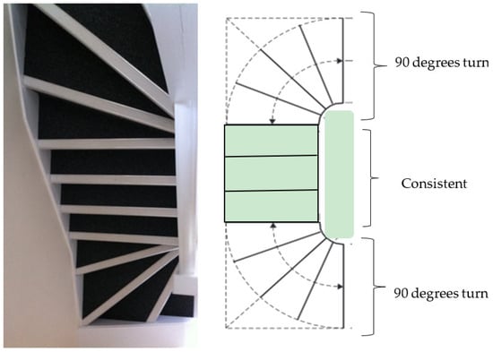 The 2010s exemplar house had a winder staircase, with 11 steps and no handrail. The winder stairs were L-shaped, but instead of a straight landing, these stairs incorporated a 90-degree turn at the start and the end of the stairs (Figure 3). The winder stairs created exciting features with a seamless transition and saved more space without a landing. However, these stairs were more challenging to navigate than the other stairs. It is also true that negotiating winder stairs requires more center support.