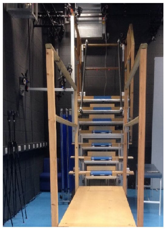 The laboratory measurements were conducted on a custom-made instrumented seven-step staircase with handrails on each side of the experimental staircase. The stairs had a top and bottom landing of sufficient length to complete an entry and exit phase. Each step had a riser height of 19.5 cm and a going length of 23.5 cm []. The bottom four steps contained a Kistler (9260AA, Kistler AG, CH) force platform on each step (Figure 4).