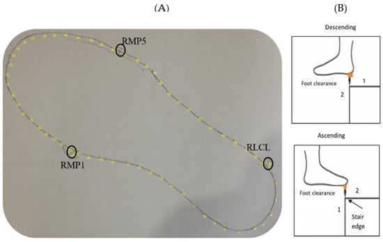 Foot clearance and foot contact length calculated from the VICON system motion analysis data are explained in the previous work [,]. In brief, the participant’s instrumented shoes were digitalized manually by obtaining a two-dimensional outline after taking a picture of the shoe outline drawn on a piece of A4 paper (Figure 5A) and imported using ImageJ 1.38e (National Institutes of Health, Bethesda, MD, USA). The coordinates of up to 600 virtual markers representing the individual shoe sole outline were calculated in MATLAB. The position of three markers fixed on the shoe were also recorded (first metatarsophalangeal joint (RMP1), fifth metatarsophalangeal joint (RMP5) and calcaneus lateral (RLCL)) in the two-dimensional drawing using the static measurement. These static measurements included the above three markers’ positions in a 3D (three-dimensional) space, which helped determine the position of the shoe’s virtual outline relative to the markers. The virtual outline of the shoe was then projected in movement trials, again relative to the three reference foot markers.