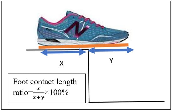 VICON foot contact length ratio calculation. The foot contact length ratio was calculated at touch-down using the rigid virtual shoe (blue line) as follows: foot placement ratio = (x/(x + y)) × 100%. Orange line shows the total length of the shoe.