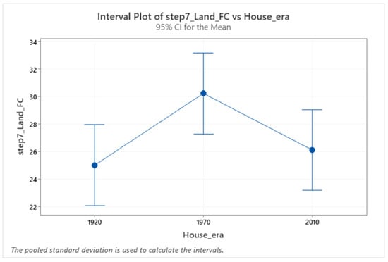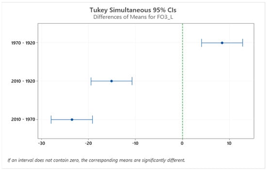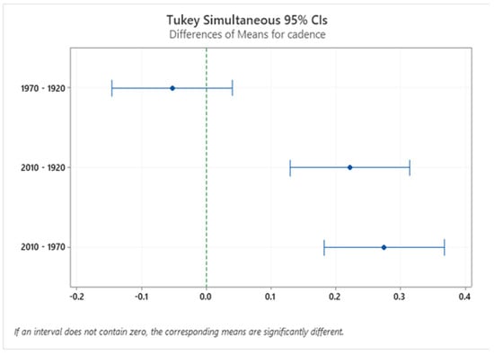 Confidence interval (CI) for cadence in the three different houses. The confidence interval range for the means of these house pairs (2010–1970, 2010–1920) does not include zero, which indicates that the difference is statistically significant.
