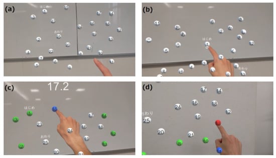 MR-TMT play screen from subject’s viewpoint. The target was a spherical white object. The elapsed time was displayed at the top of the screen. (a) In Part A, the object is a sphere with numbers 1–25 written on it, which are touched sequentially. (b) In Part B, 13 numbers from 1 to 13 and 12 hiragana from あ to し are displayed. The subject is required to touch the numbers and hiragana alternately and in order (1, あ, 2, い, 3, ..., し, 13). (c) Screen when touching the correct object. When the correct object is touched, its color changes from white to blue. When the next correct object is touched, the color changes from blue to green. In other words, the correctly touched objects are green and the last correctly touched object is blue. (d) Screen when touching the wrong object. If the wrong object is touched, it changes to red to make the subject aware of the incorrect selection.