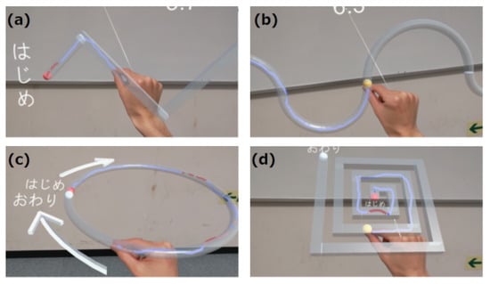 Screen of MR-Trace task. The translucent gray patterns in the image show the target paths to be traced. The target paths are (a) zigzag, (b) wave, (c) circle, and (d) spiral. The starting point is the red spherical object and the ending point is the white spherical object. The subject starts at the red sphere and traces through the target path to the white sphere using the fingertip. The fingertip trajectory is displayed in blue if the trajectory is within the path and in red if it goes outside the path. (a,c) comprise the Trace task, whereas (b,d) are the Track task in which a yellow spherical object moves at a certain speed, and the user is required to move the fingertip in accordance with the movement of the yellow spherical object.