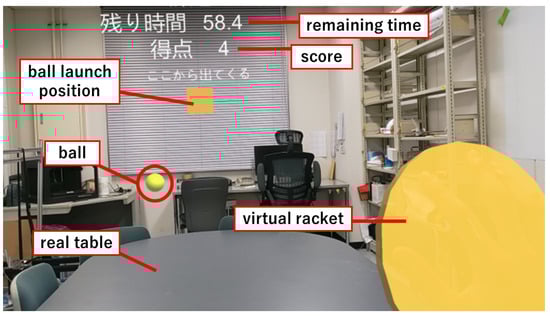 MR-BallContact play screen from subject’s viewpoint. When the right hand is recognized, a yellow disk-shaped virtual racket is displayed over the hand. A yellow cube object is displayed at the center of the screen. From this object, a ball of each color is launched in a random direction. The balls bounce on the real desk and fly toward the player. Scores are gained by touching the flying ball with the virtual racket. The remaining time of the game and the score (number of balls touched) are displayed at the top of the screen.