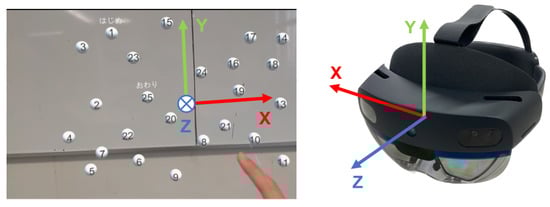 This section describes the results of the experiments conducted for each application. The left-hand coordinate system used in the graphs is the same as that used in Unity. The origin of the coordinates is the position of HoloLens 2 when the application is launched. The x-, y-, and z-axes point to the right, upward, and frontal directions, respectively, as seen by the HoloLens 2 wearer (Figure 4).